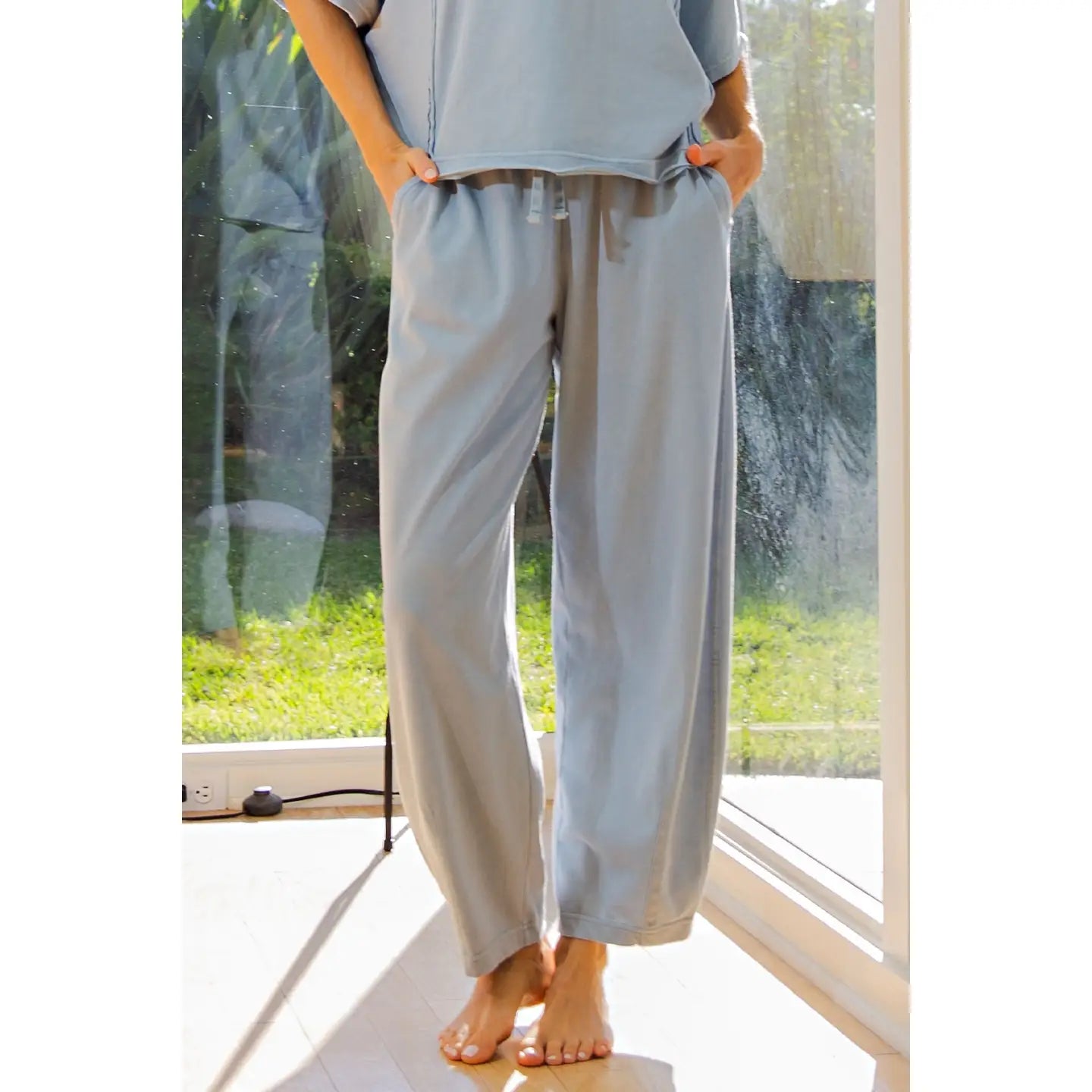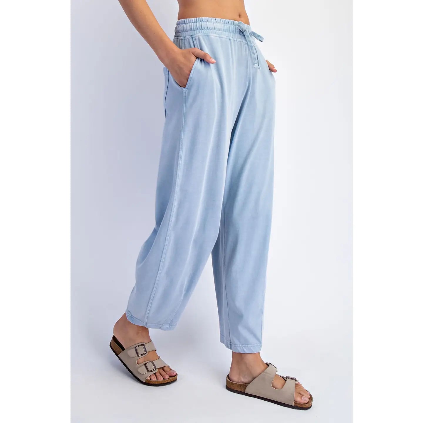 -Made from soft, breathable mineral-washed cotton, these mid-rise cropped pants offer a relaxed, effortless fit. The adjustable elastic waistband ensures comfort, while darted hems and practical side and back pockets add subtle structure and everyday functionality—perfect for casual, easygoing style. Features: - Mineral washed cotton fabric - Breathable and soft - Relaxed fit - Mid rise / Mid waist - Cropped length (28") - Adjustable elastic waistband - Darted hem - Back pockets - Side pockets Model is 5'9" and wearing size Small. Fabric: 60% Cotton, 40% Polyester.