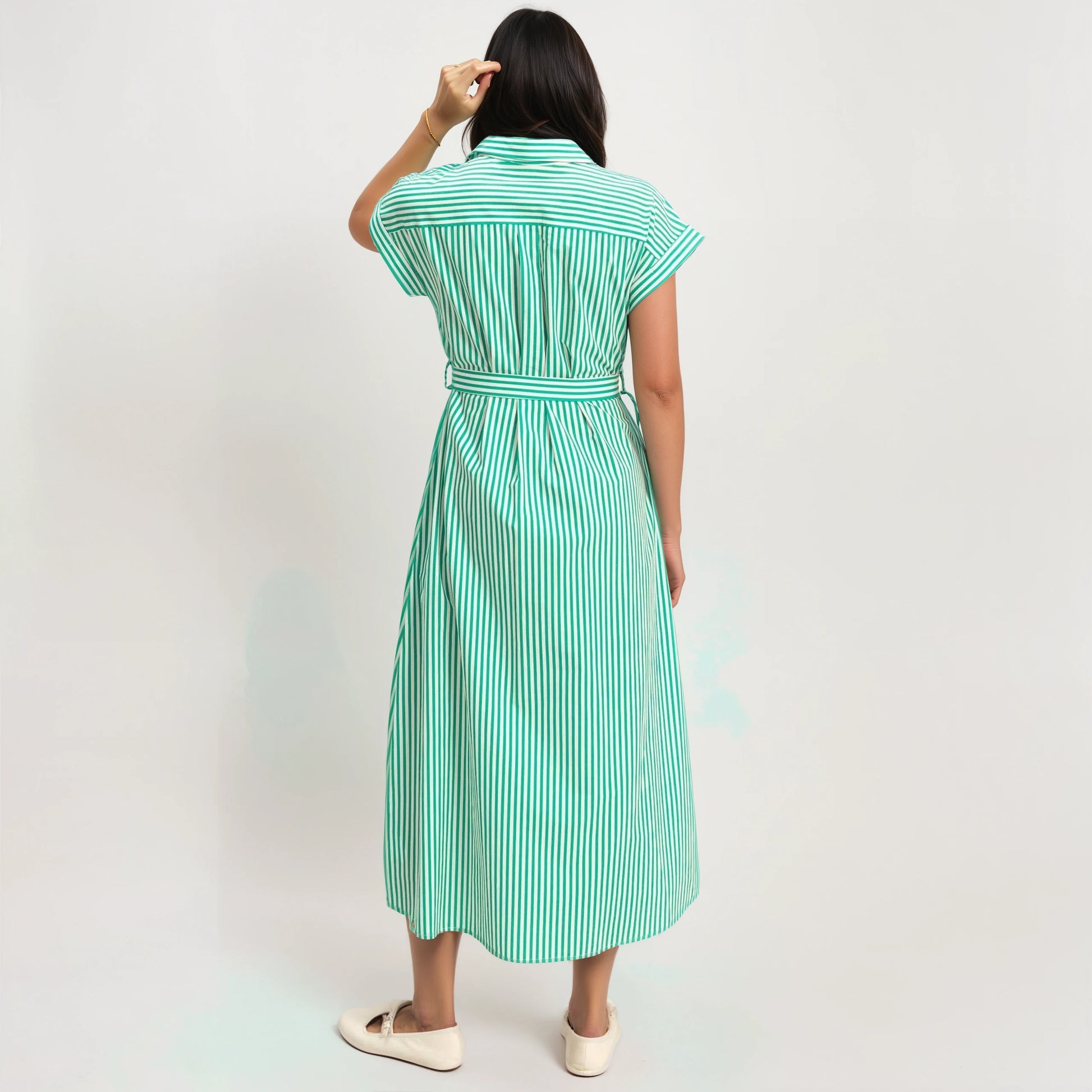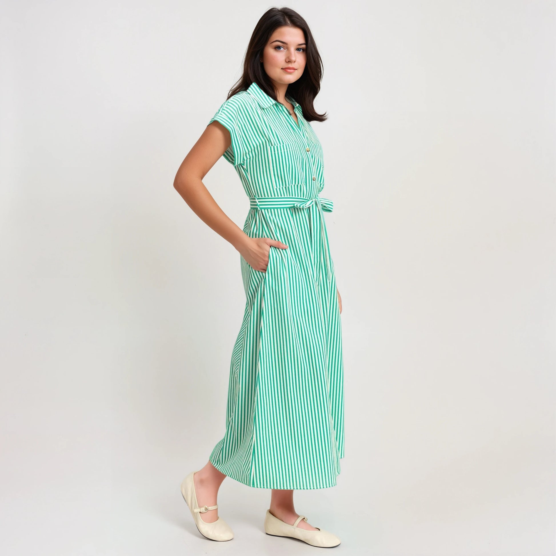 Exude sophistication in this striped poplin shirt dress, showcasing a sharp spread collar and relaxed, cuffed dolman sleeves. The button-front silhouette features practical chest and side pockets, plus a tie-waist sash for definition. Finished with a back box pleat, style this midi with espadrilles for a chic, effortless daytime look. 100% cotton Model Is 5' 8" Tall, 32" Chest, 25" Waist, 35" Hips And Wearing A Size Small I. Designed In The USA